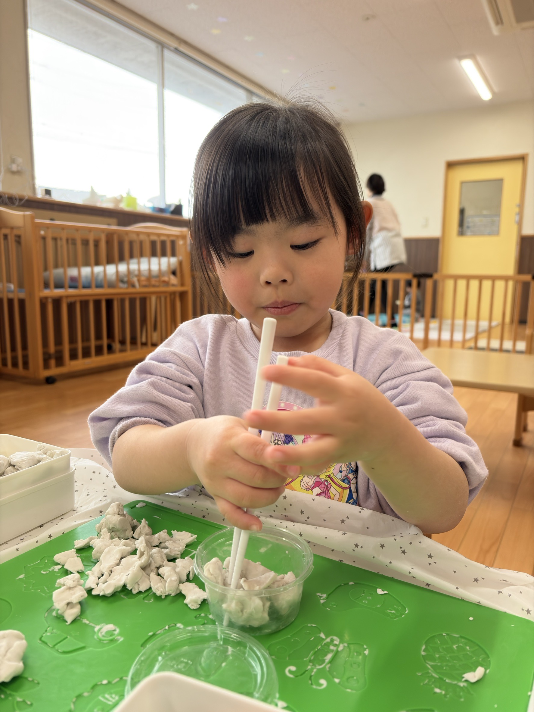 昨日の朝は、デコレーションボールで花の形を作って遊びました♪