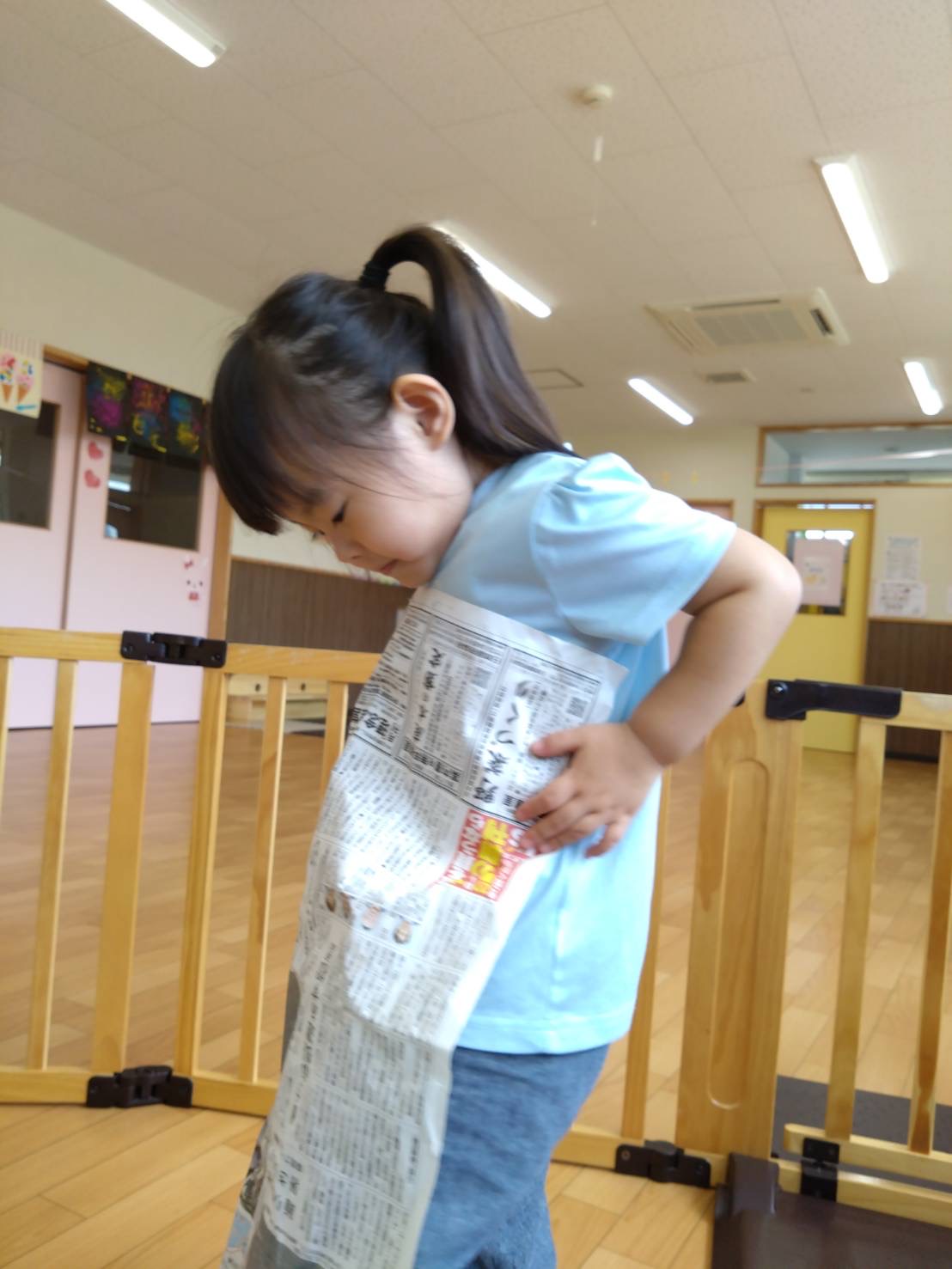 新聞紙遊びでは、新聞紙を腰に巻いて
