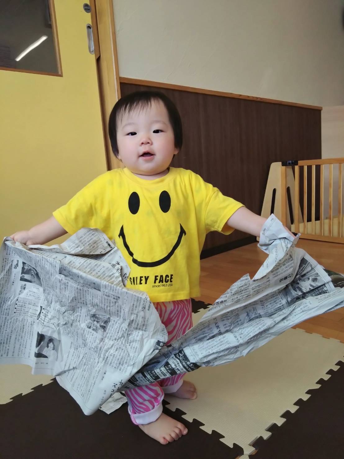 ビリビリ 新聞紙をやぶいて、ニッコリ😊