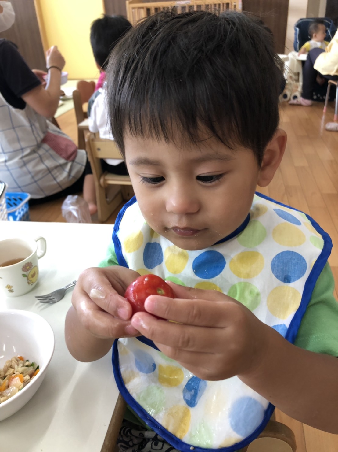 トマトちゃんです🍅真っ赤なトマトをいただきまして、お昼にみんなで食べました😋