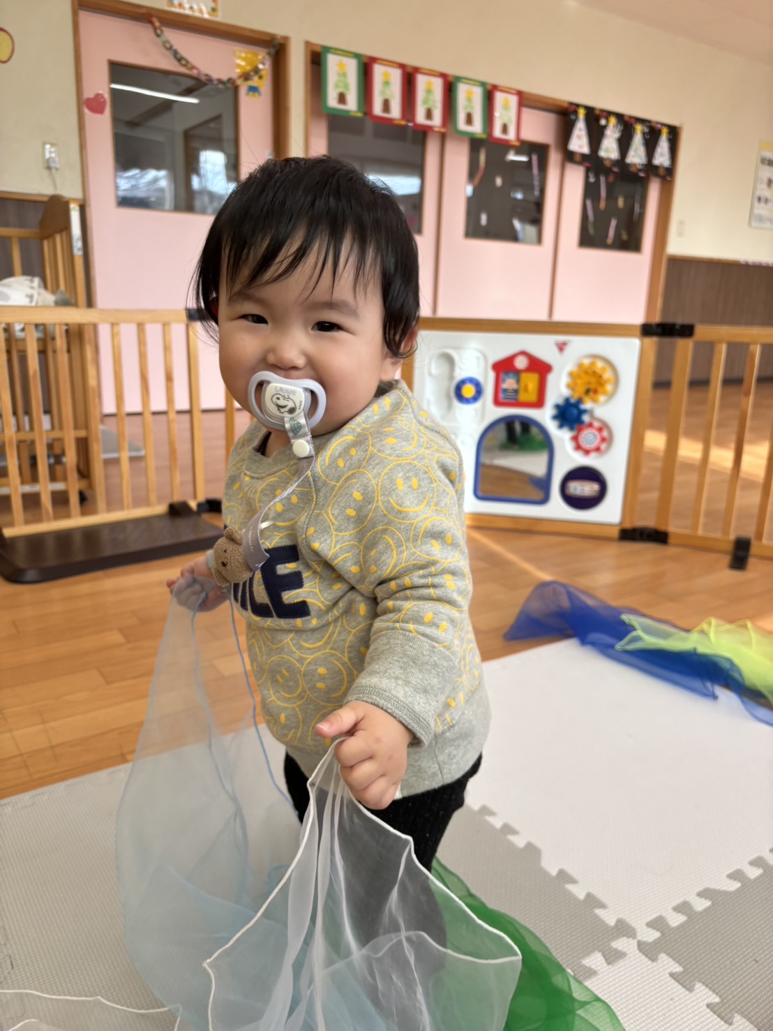 0歳児のお友だちは、スカーフ遊びをして