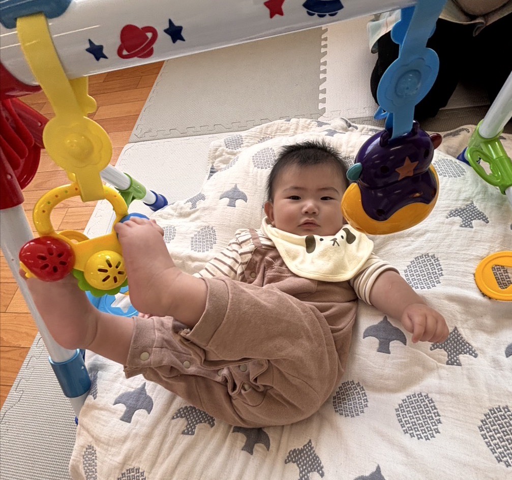 上手に足を使って、ベビージムで遊んだよ🎶