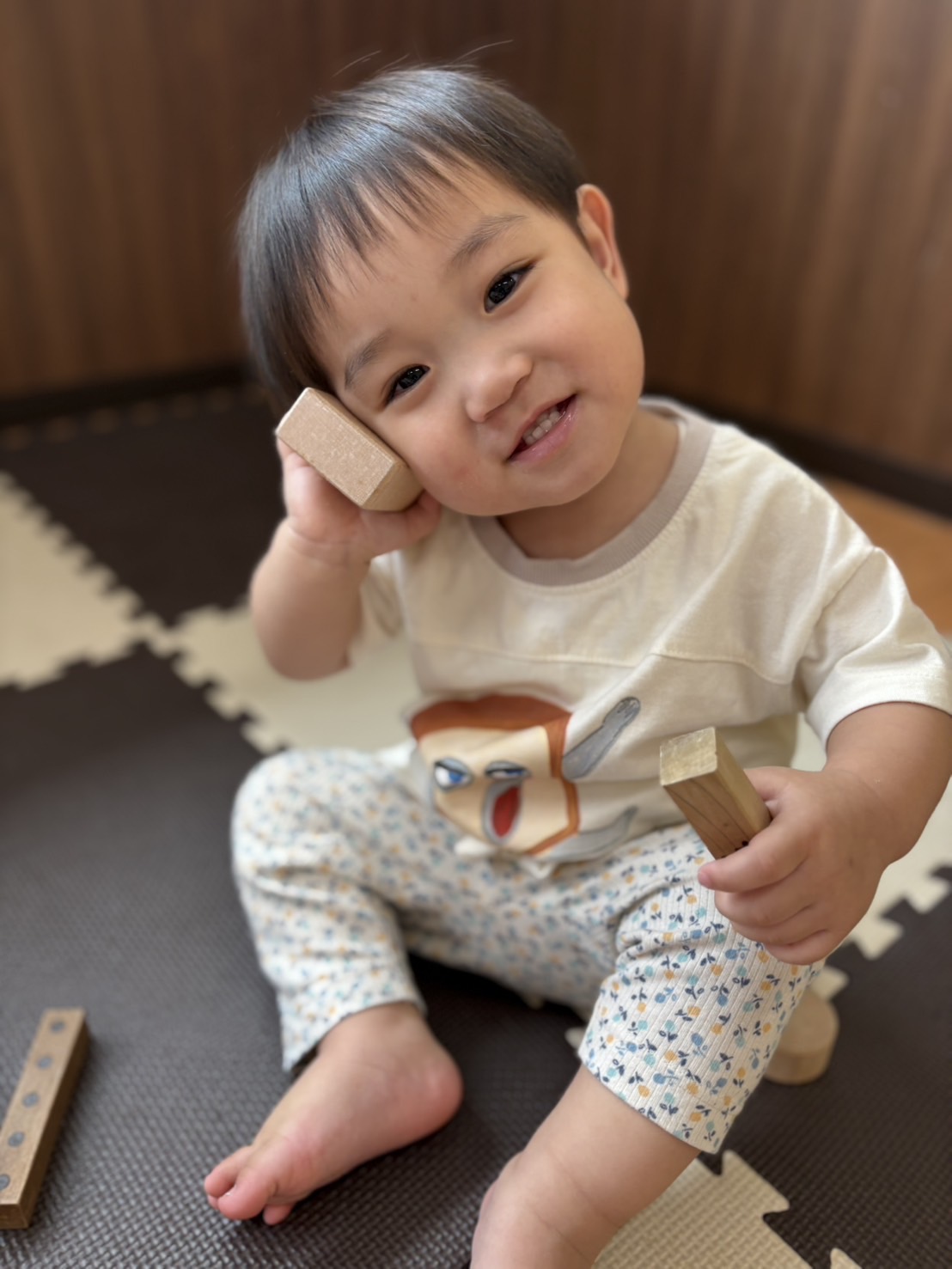 積み木を耳に当てている姿を見て