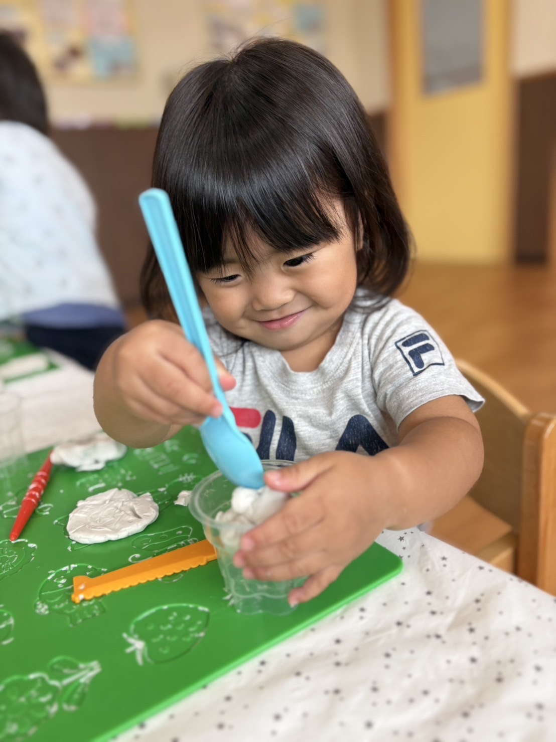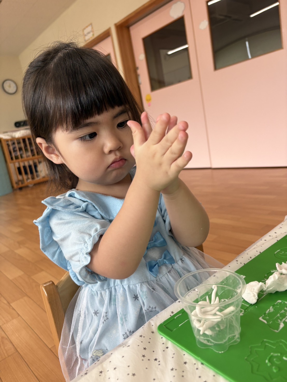 カップの中に粘土を集めて入れたり
