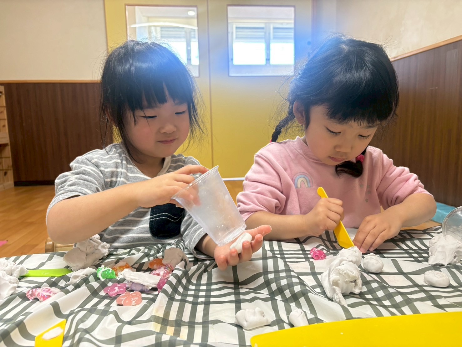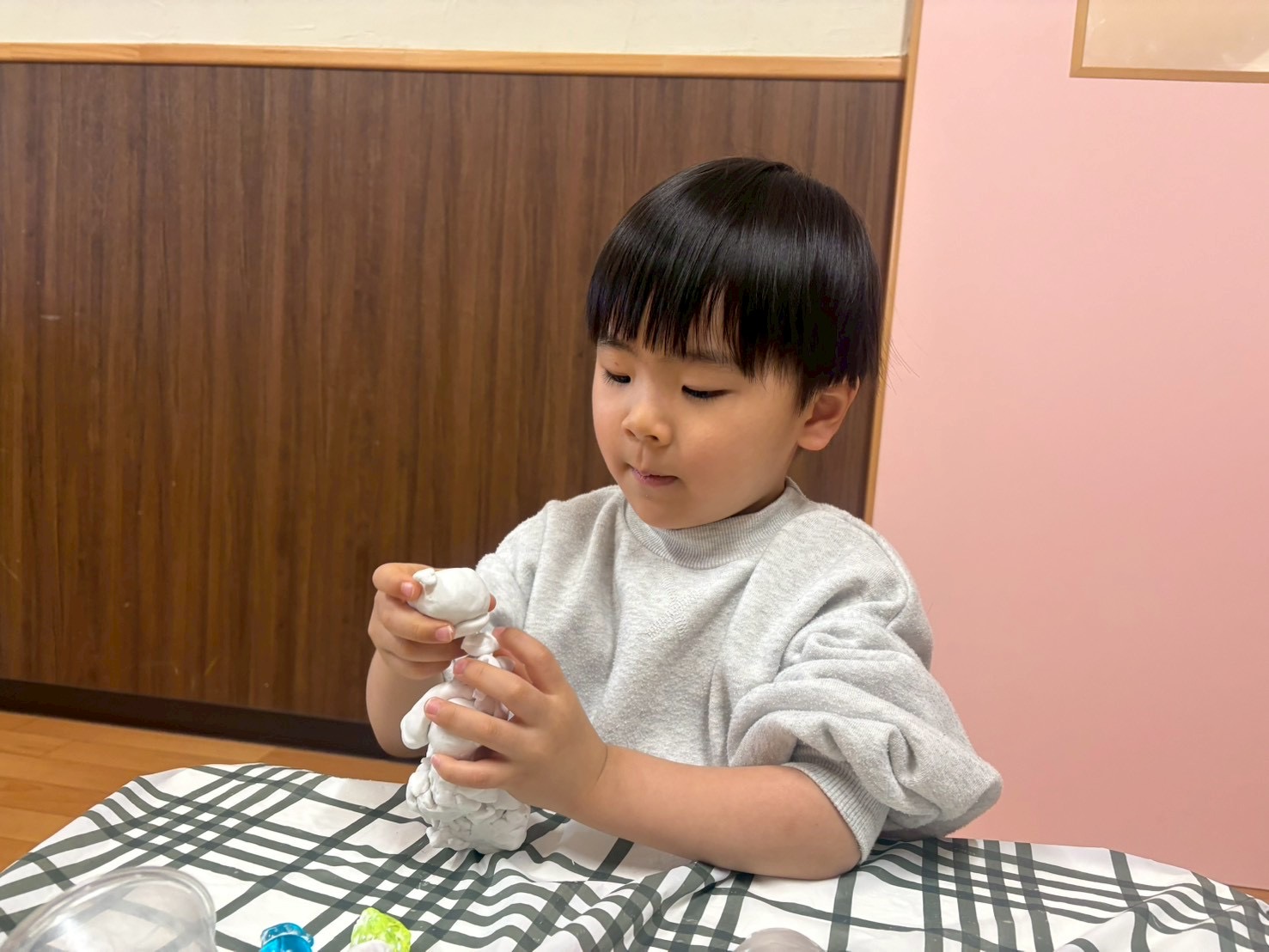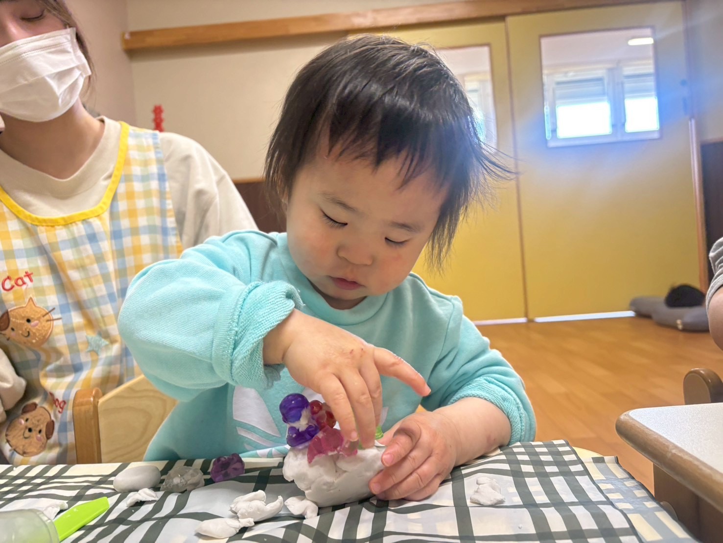 1、2、3歳児さんは避難訓練後、粘土遊びをしました♪