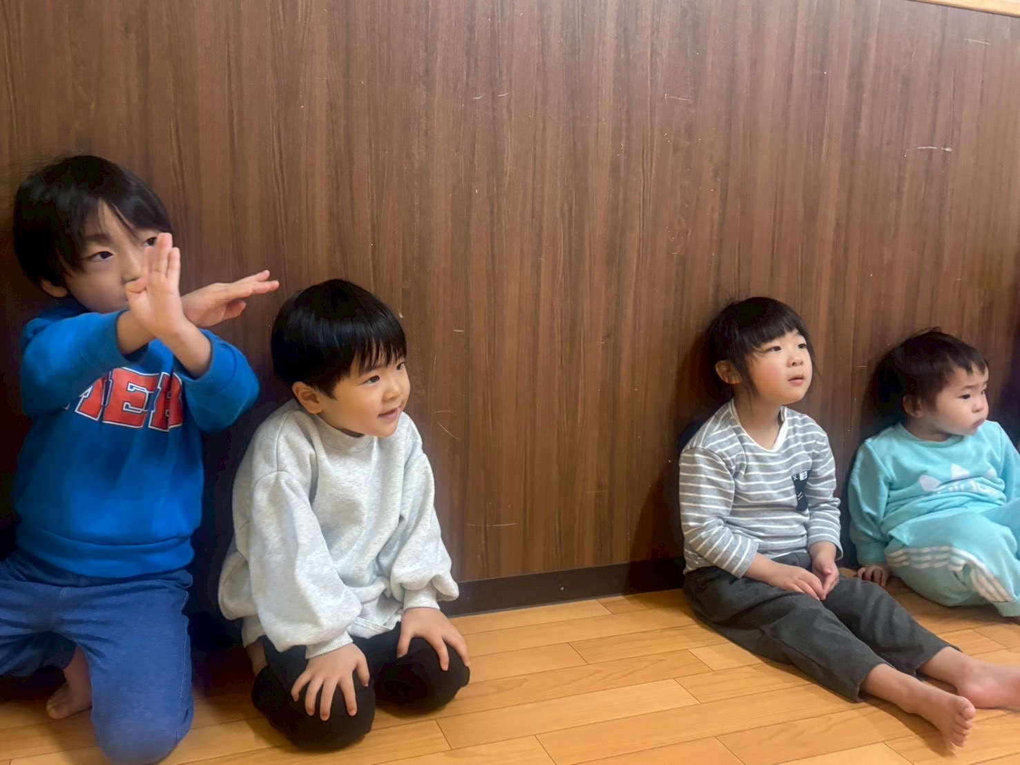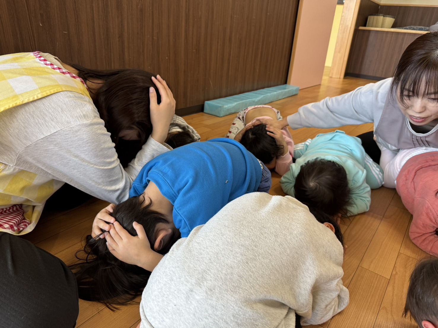 「地震です!」の声で安全な場所へ避難し、すぐにダンゴムシポーズをして身を守っていました😊✨