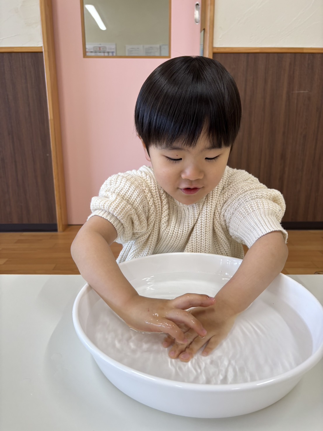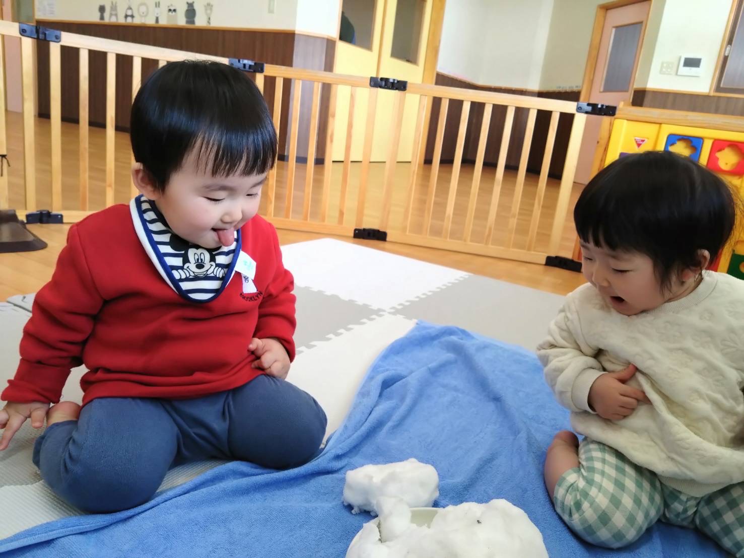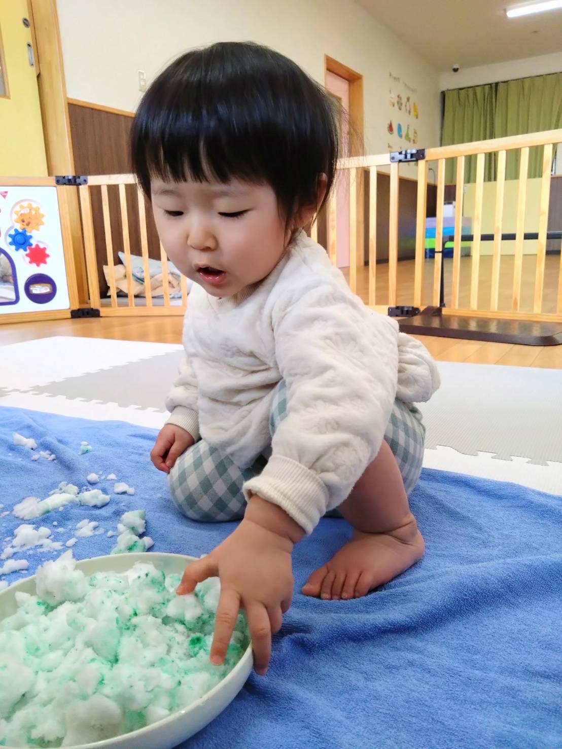 0歳児さんは、室内で雪に触れて遊びました❄️