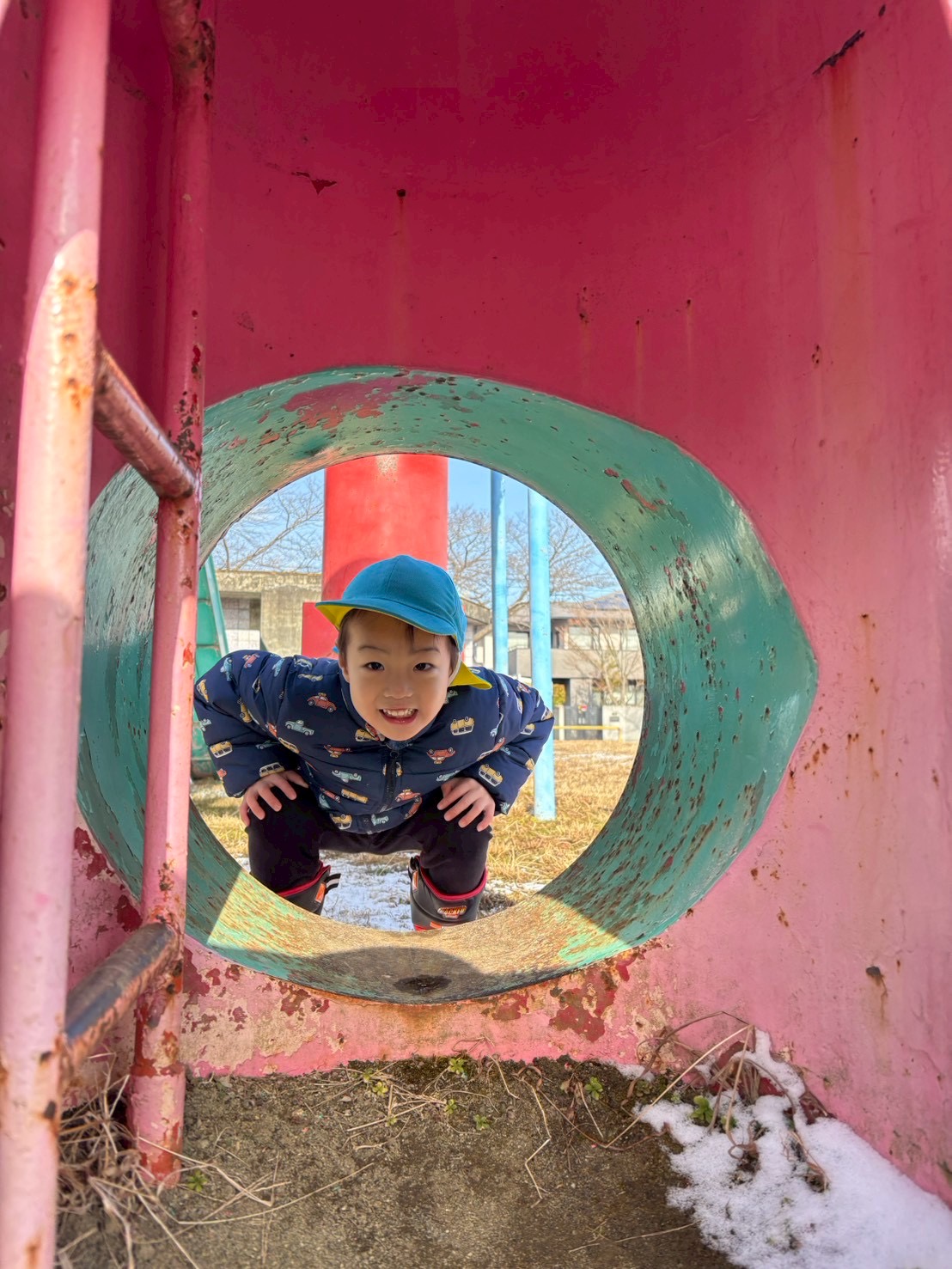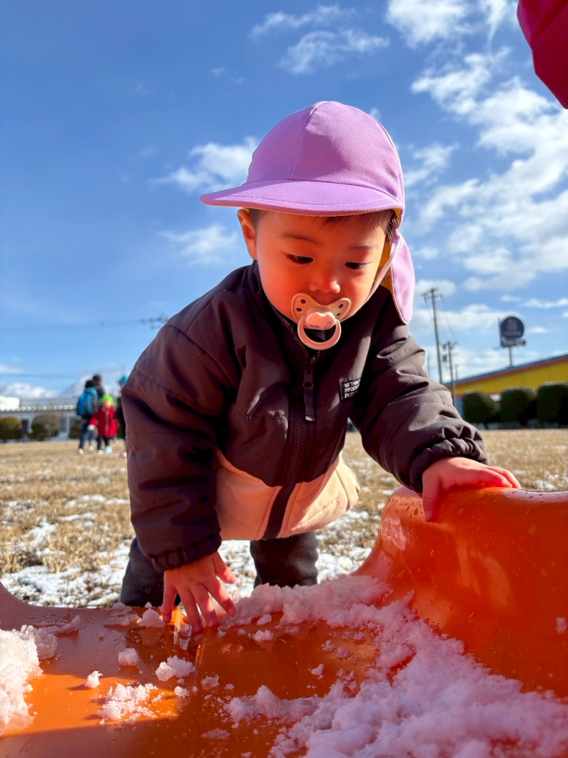 滑り台の上に雪が積もっていることに気付き、