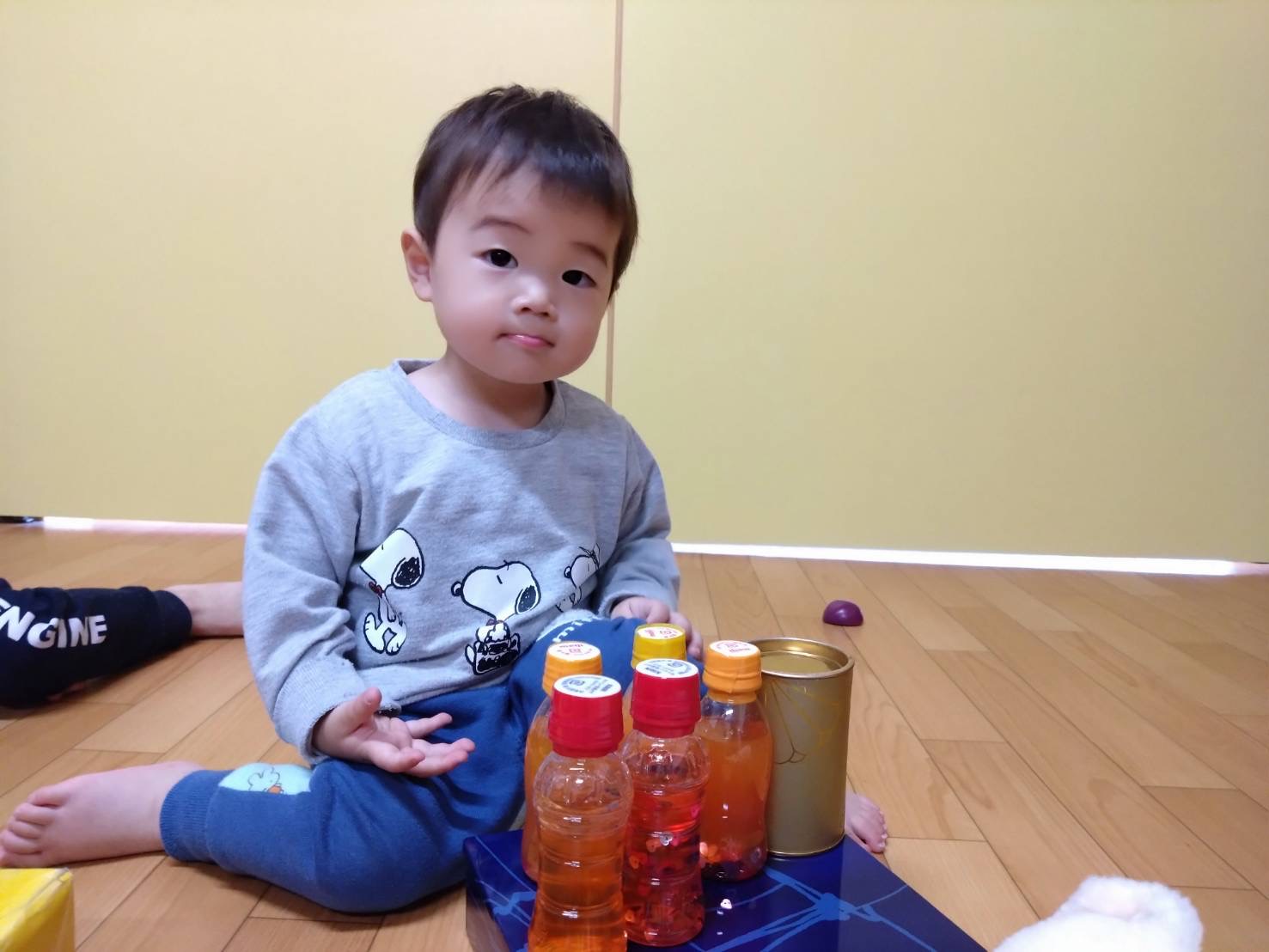 ぼくは、缶の上に並べてジュース屋さんです🍹