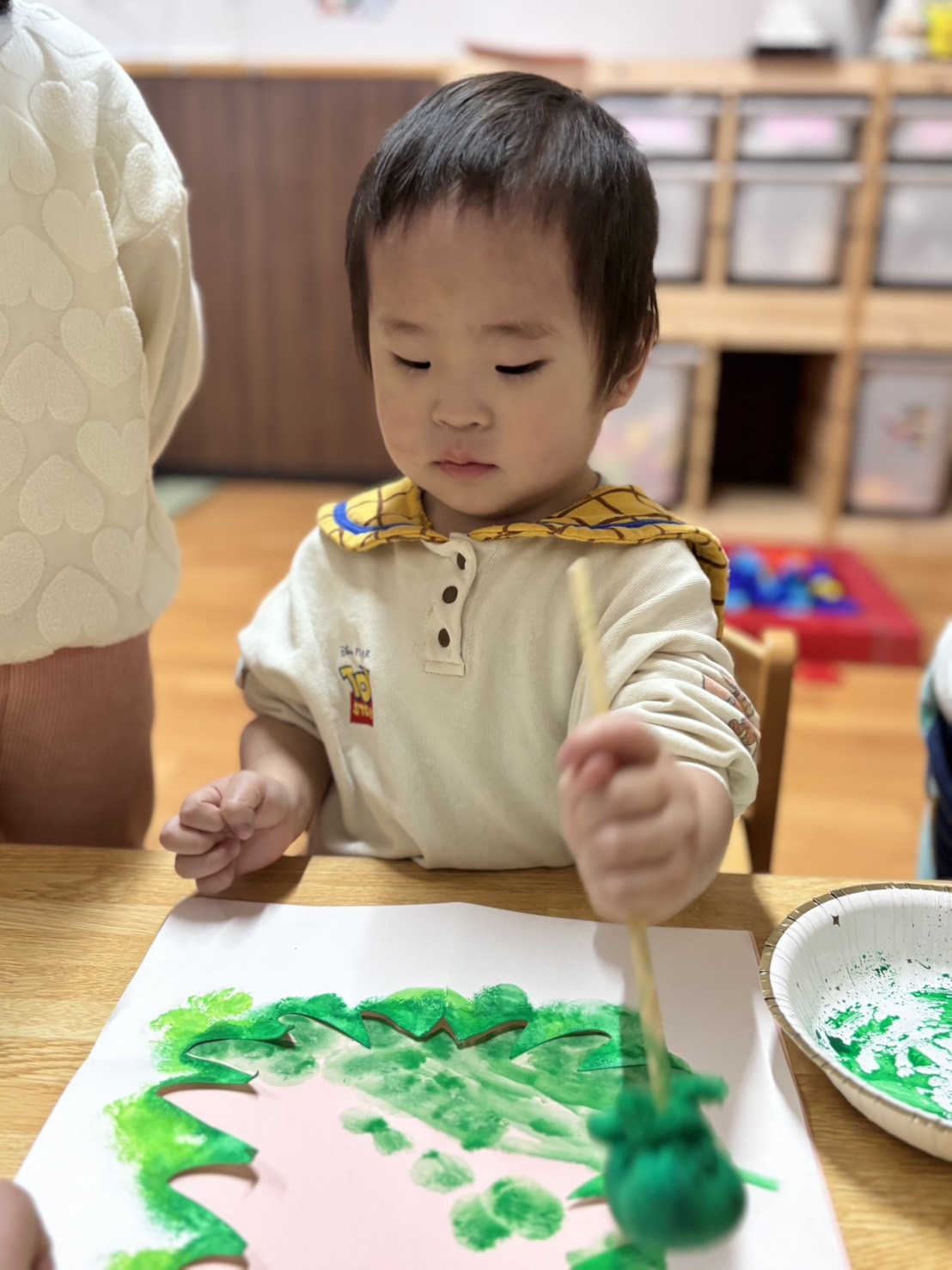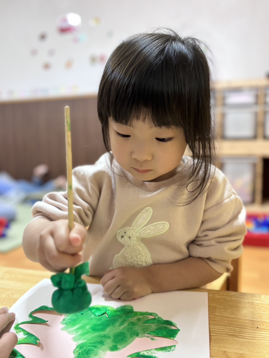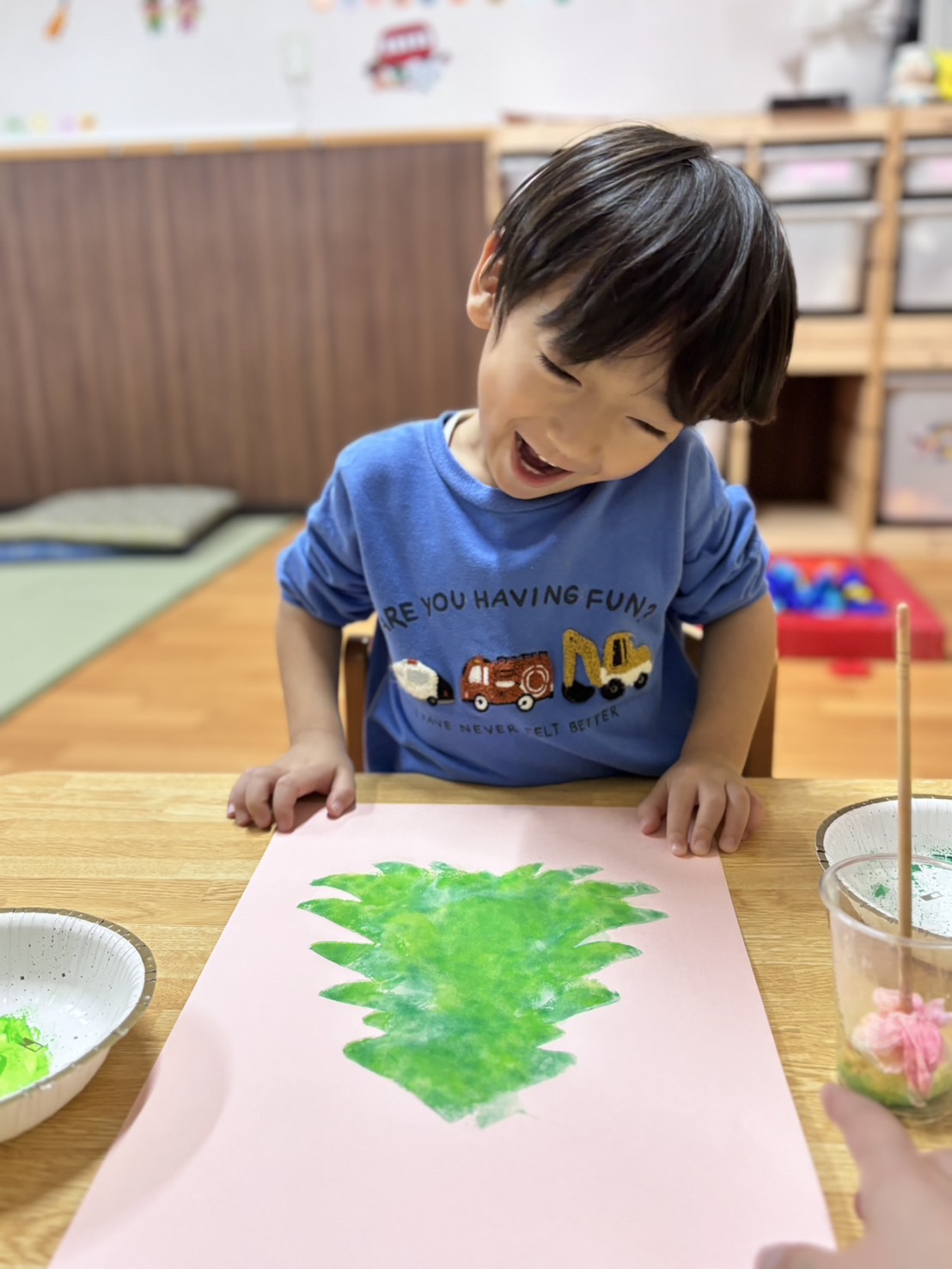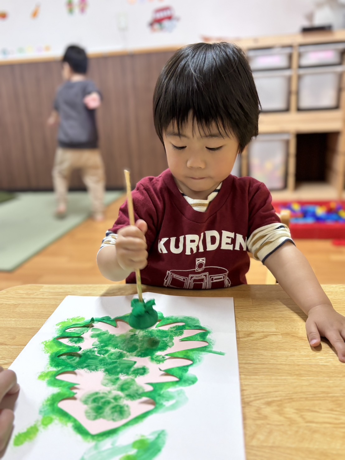 タンポに緑の色の絵の具を付けて🎨