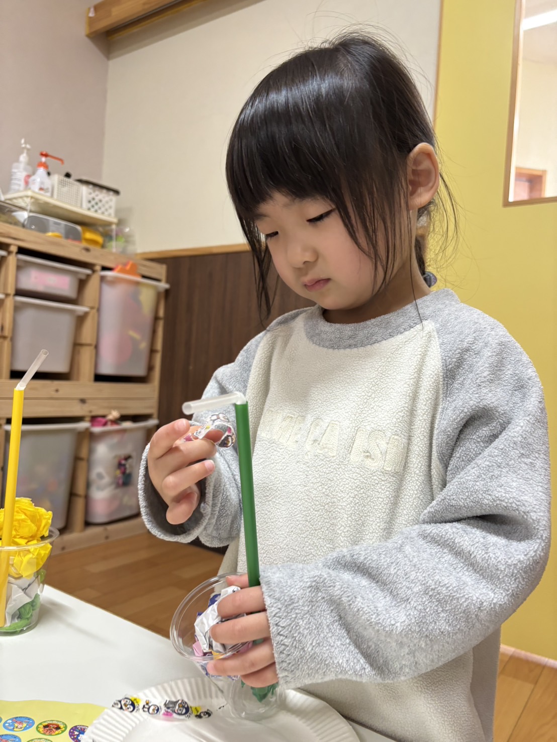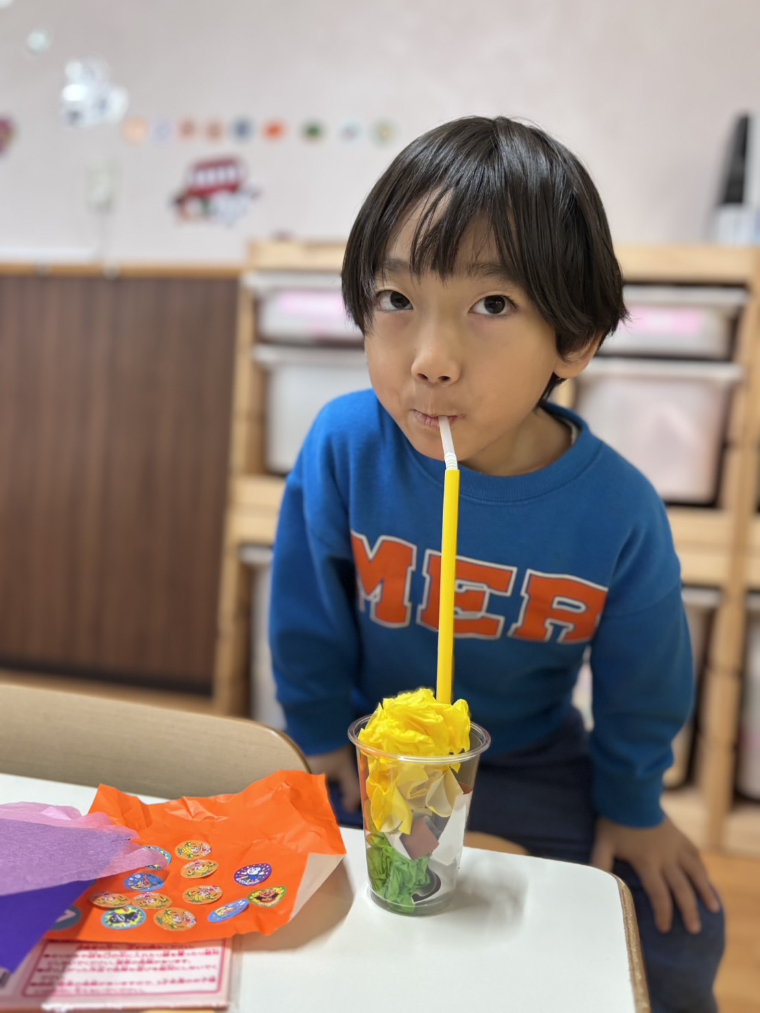 僕は、折り紙や花紙を紙コップに入れて、スペシャルジュースを作りました🍹✨