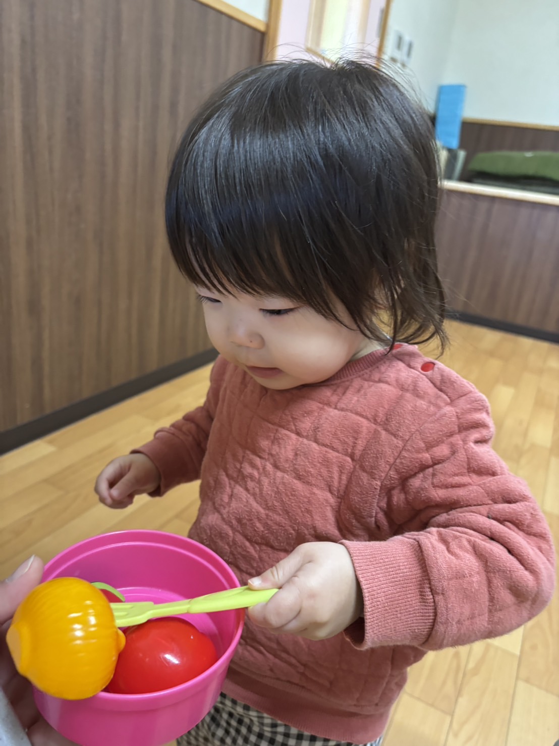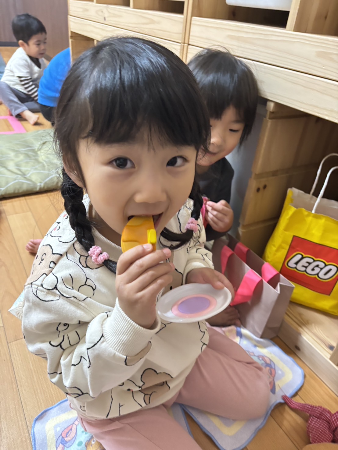 食べる真似っこをしたり、お友だちに作った料理を渡してくれました♪