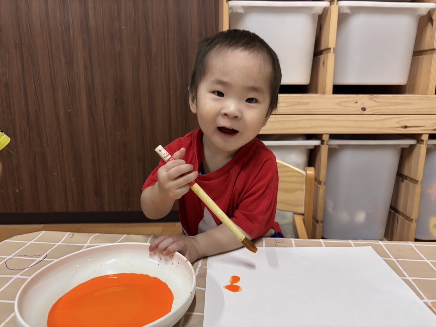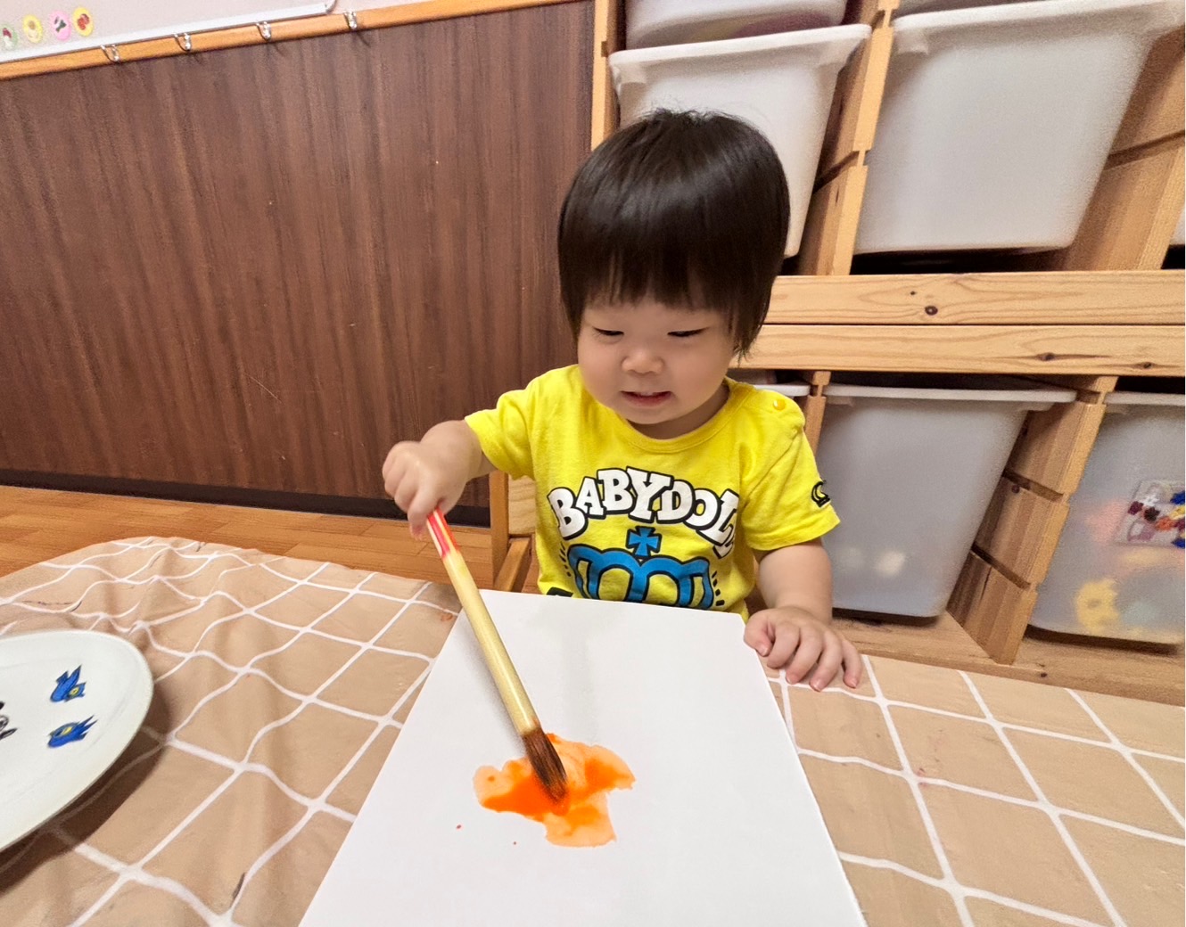 1歳児さんも、白い紙に絵の具を塗り塗り…🧡