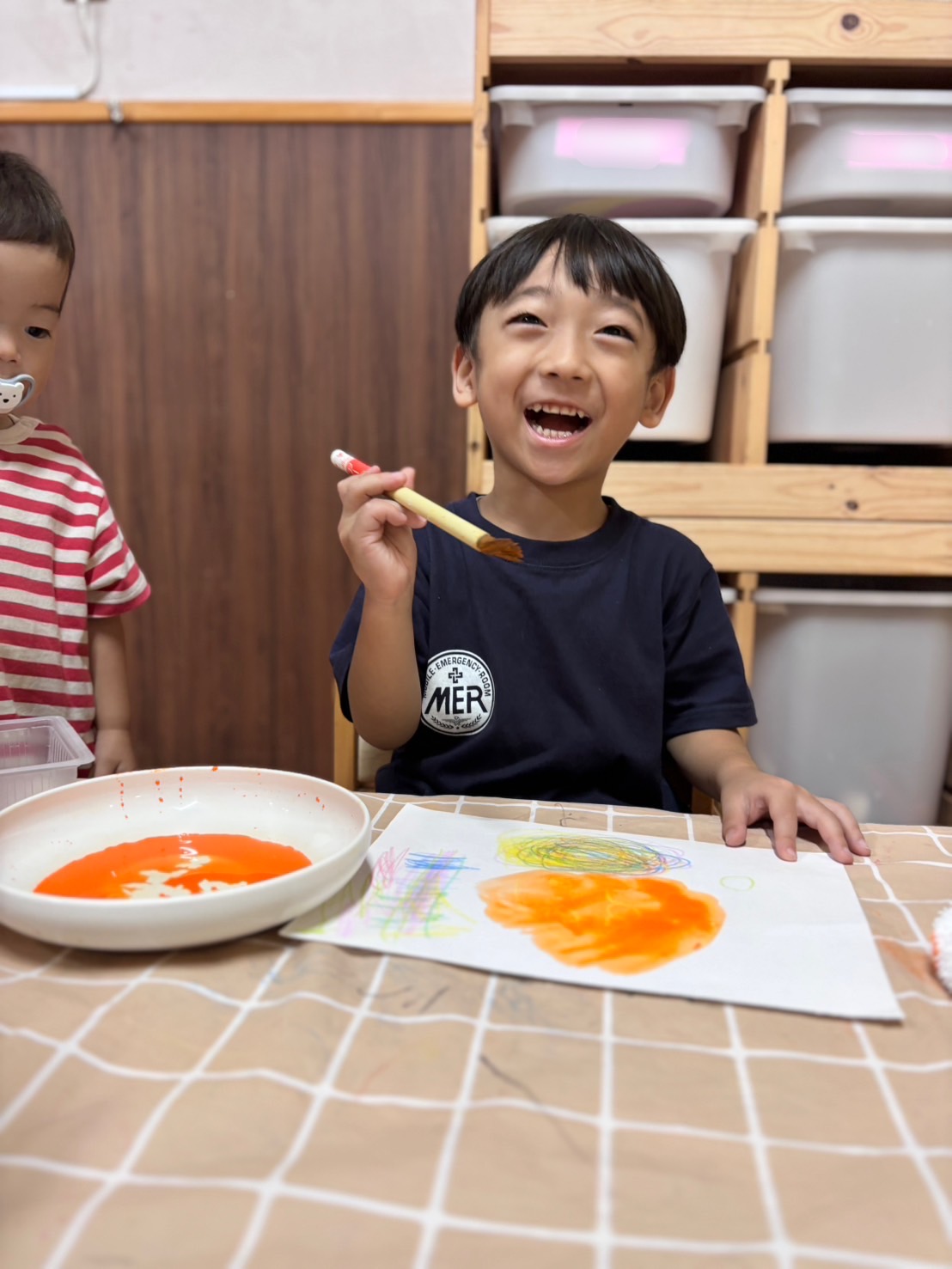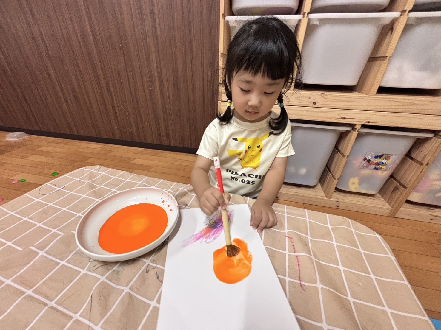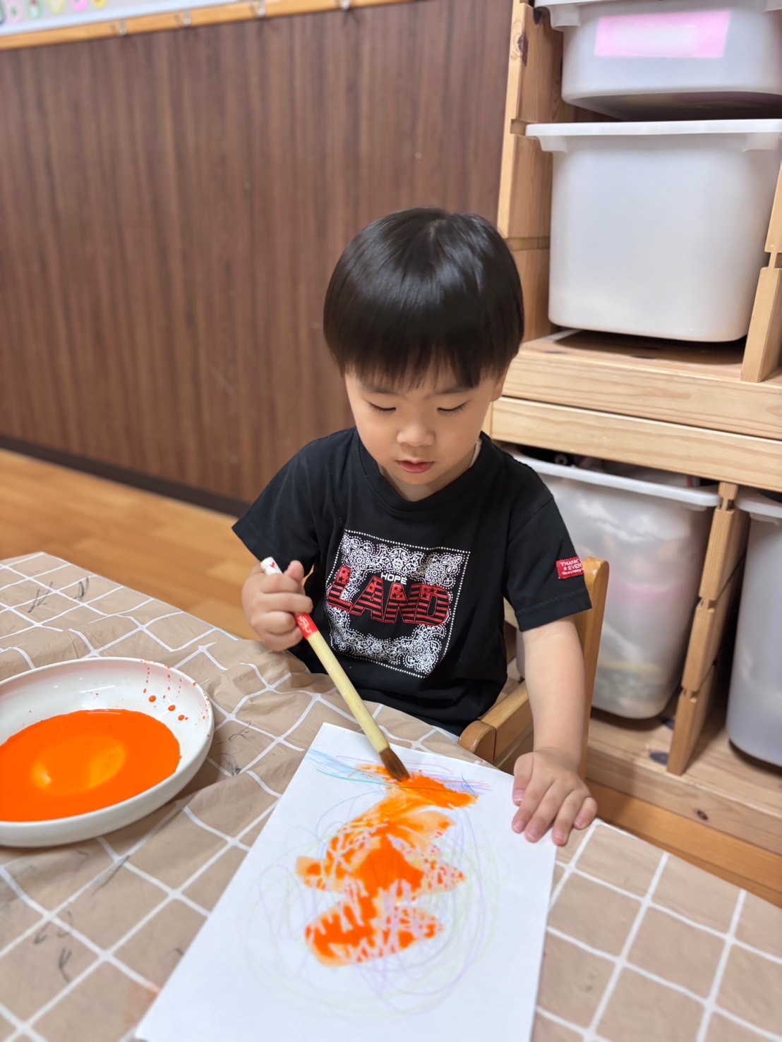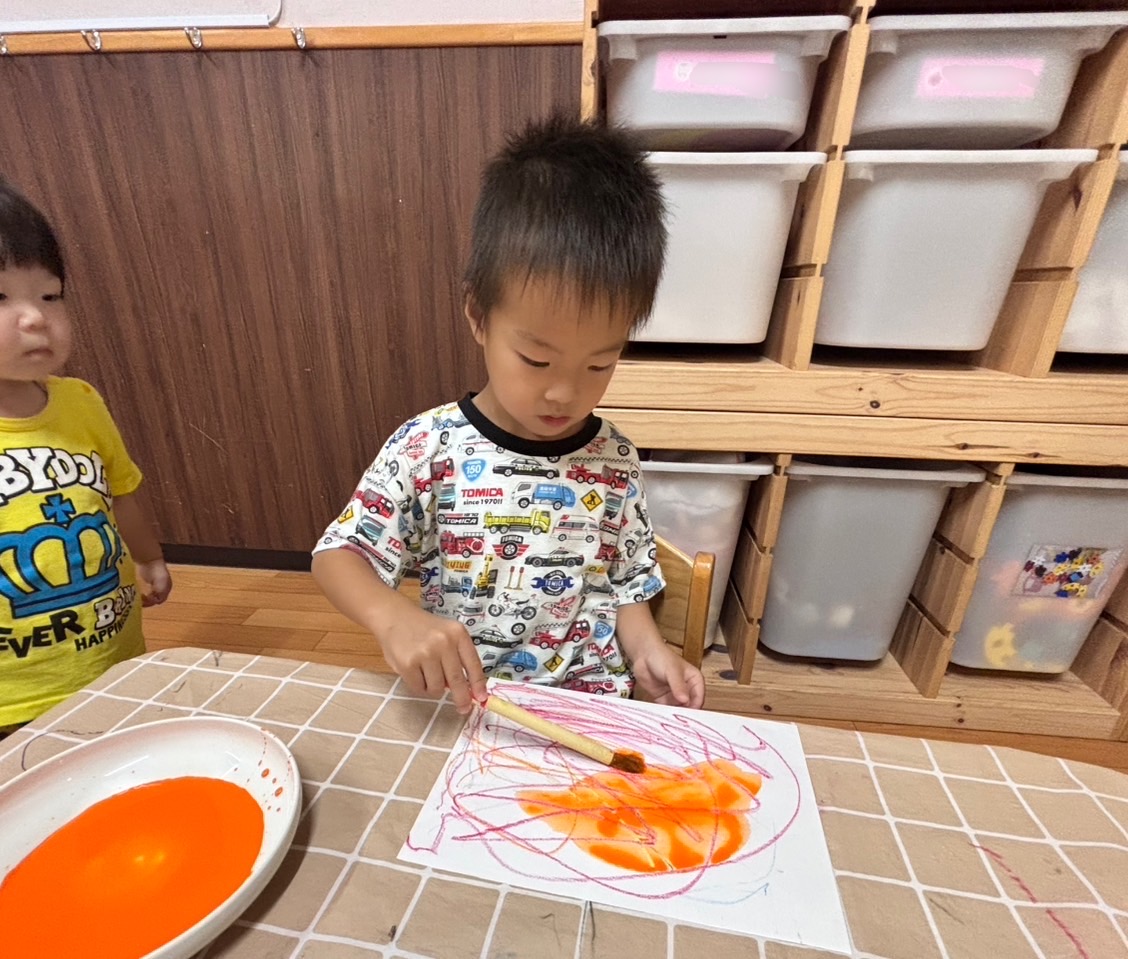 オレンジ色の絵の具を塗り、はじき絵をしました🎨