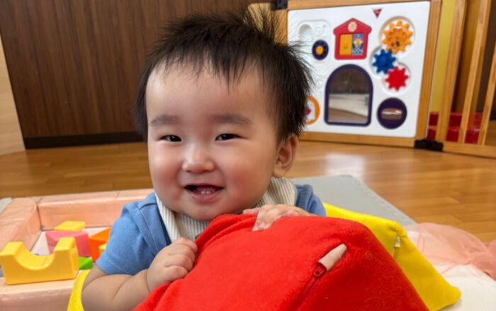 0歳児さんは積み木やシフォンガーゼで遊びました😊
