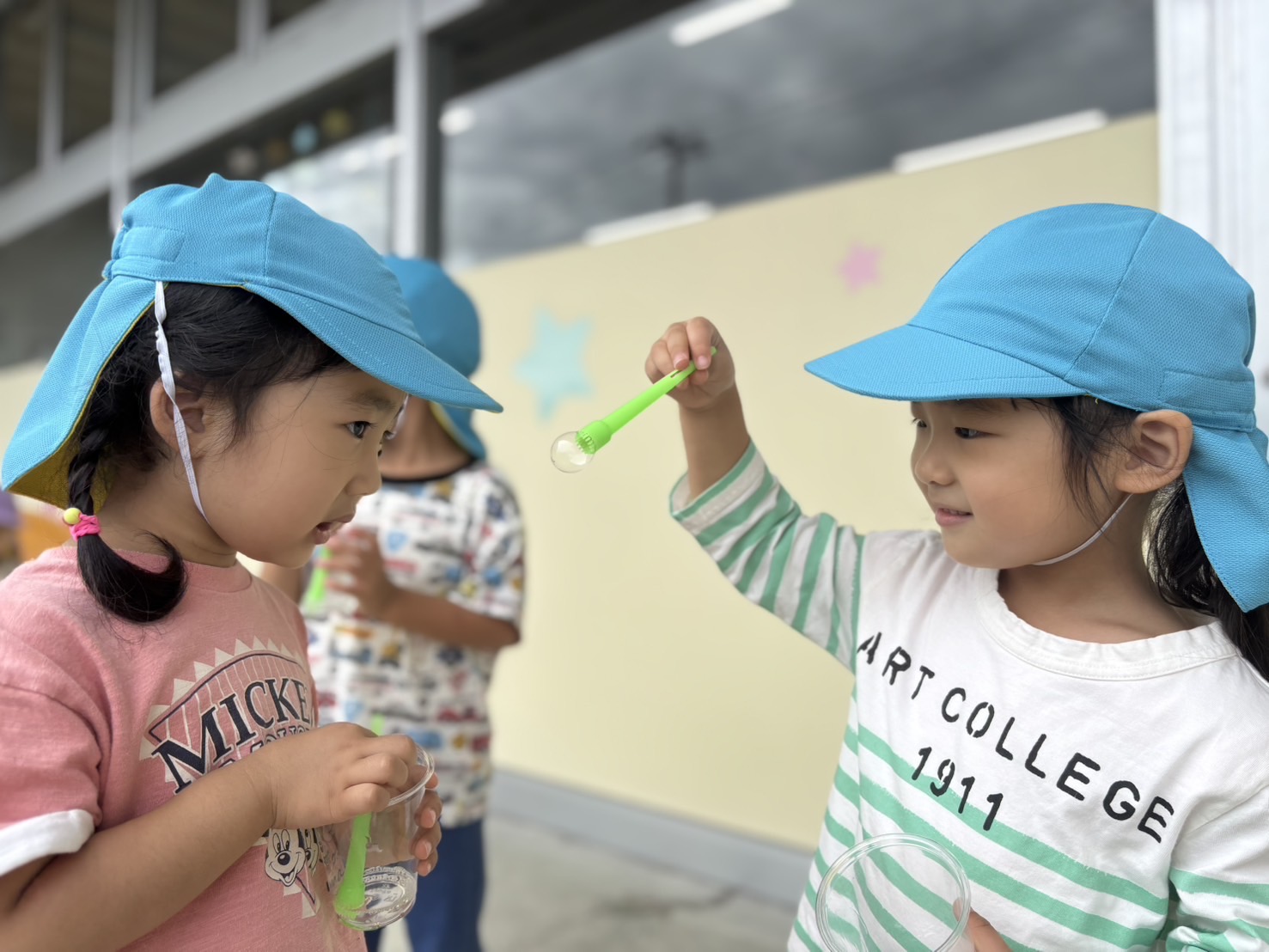 棒の先にシャボン玉がついたのを、