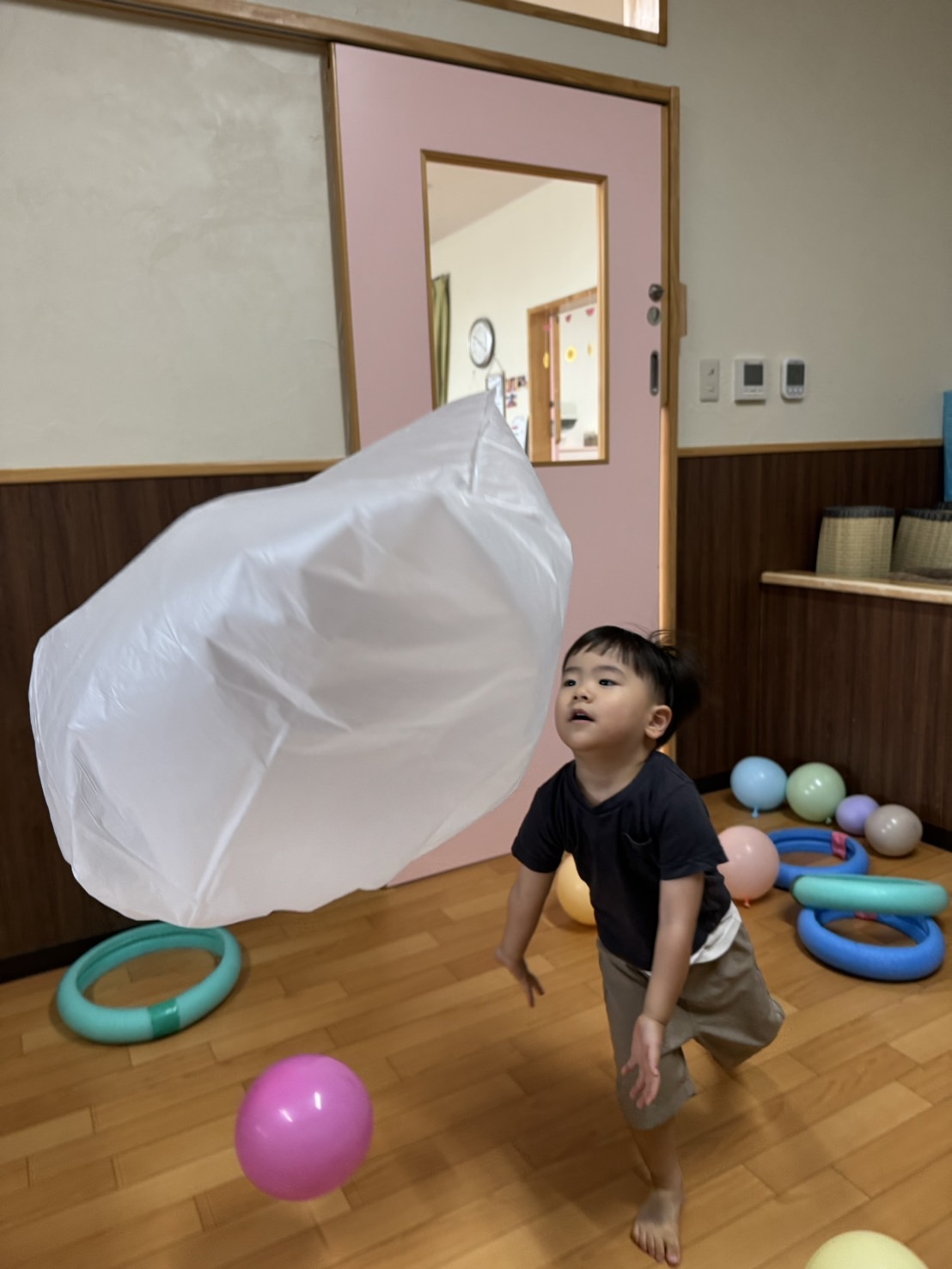 日中は、風船やフラフープを使って