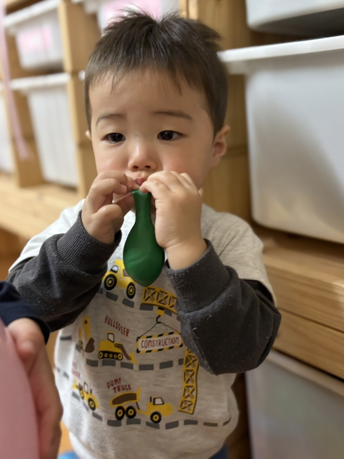 保育者が風船を膨らませる姿を見て、