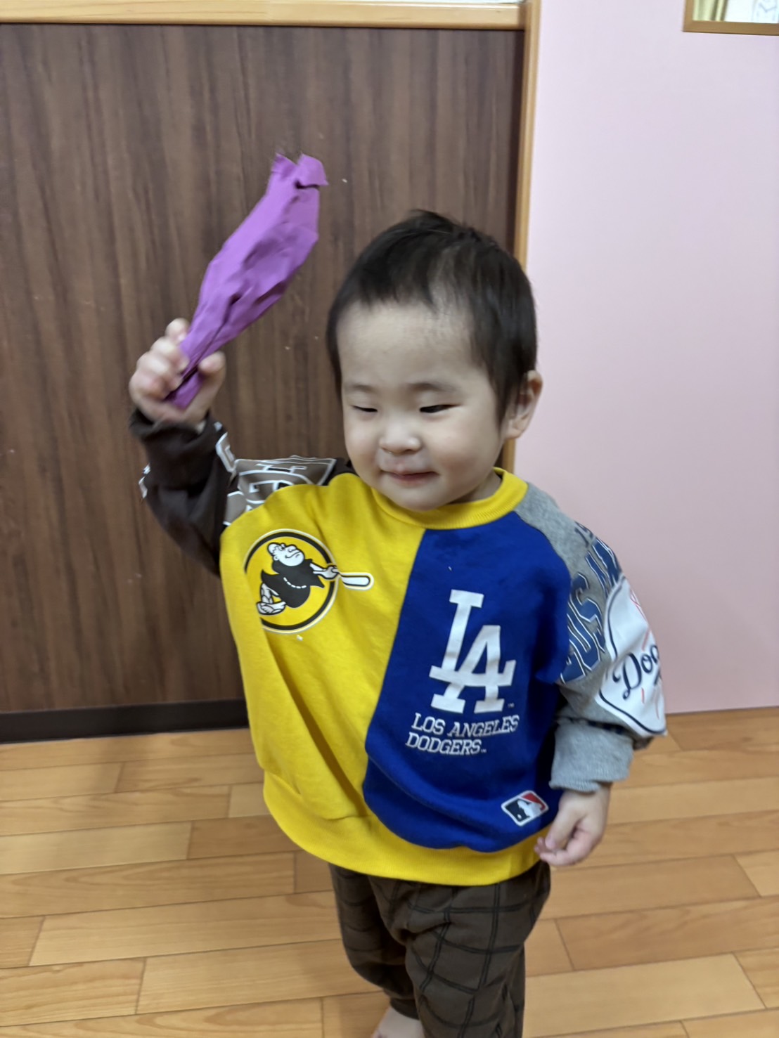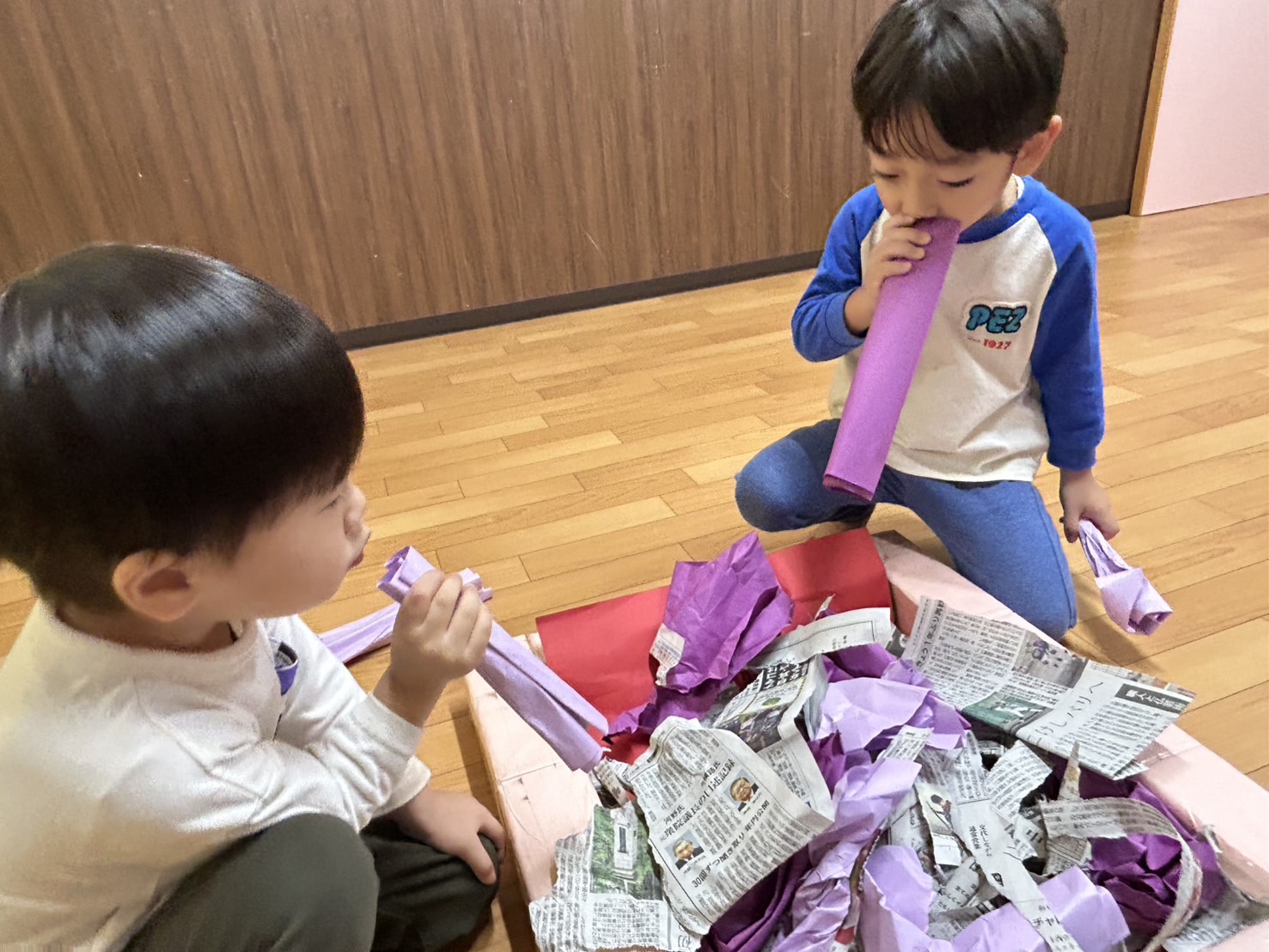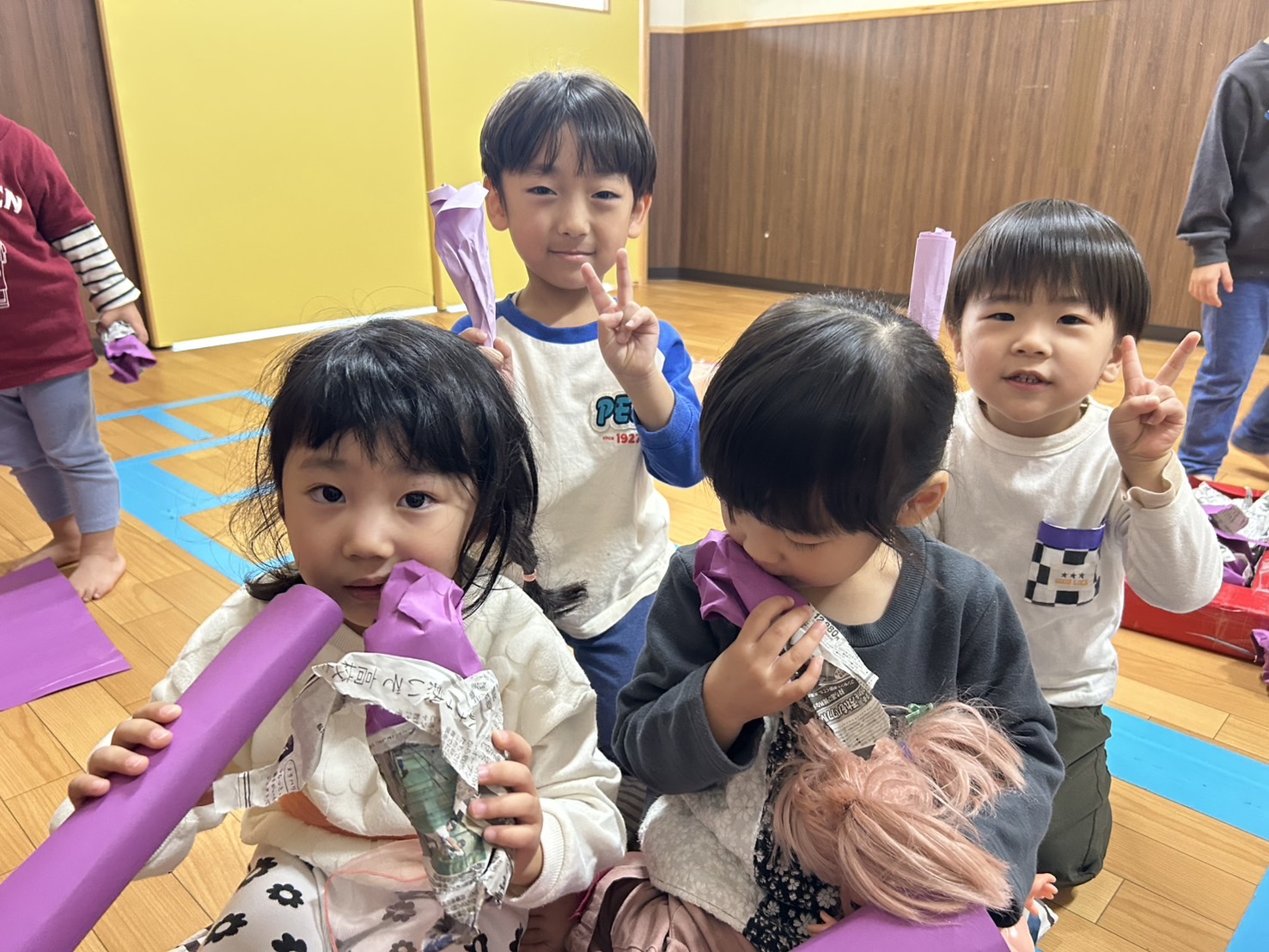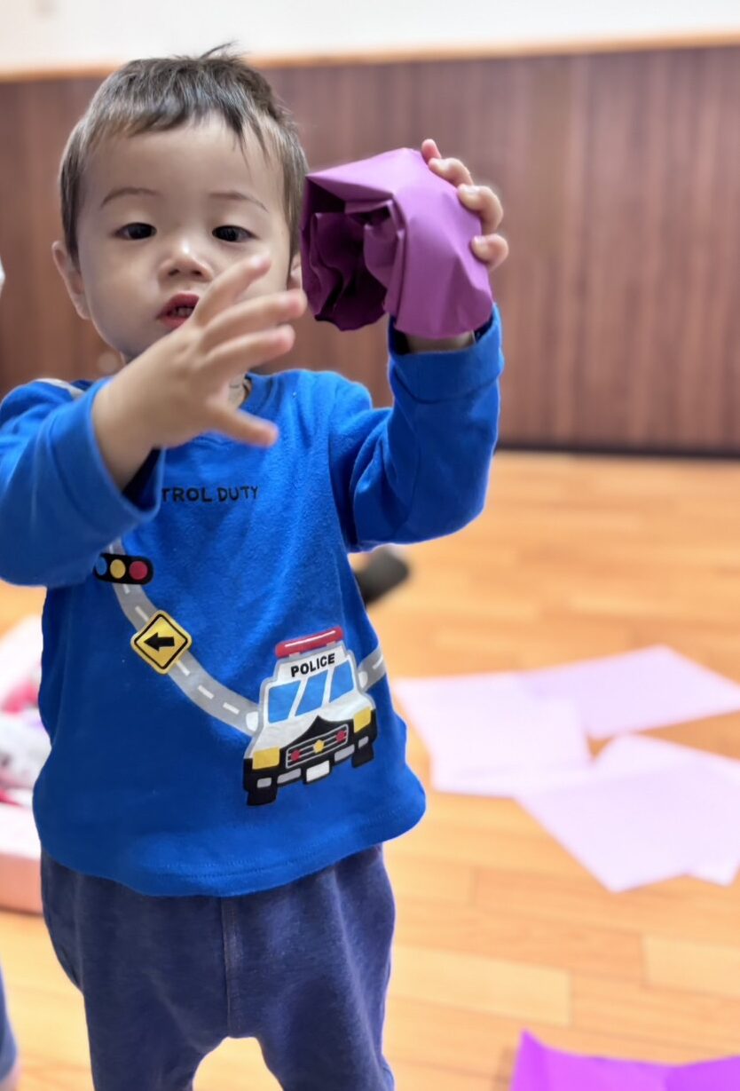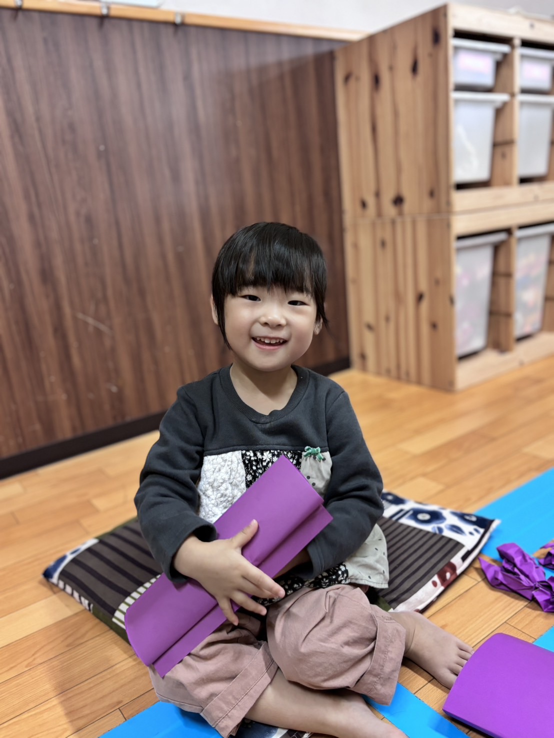 紫色の画用紙をニギニギして、