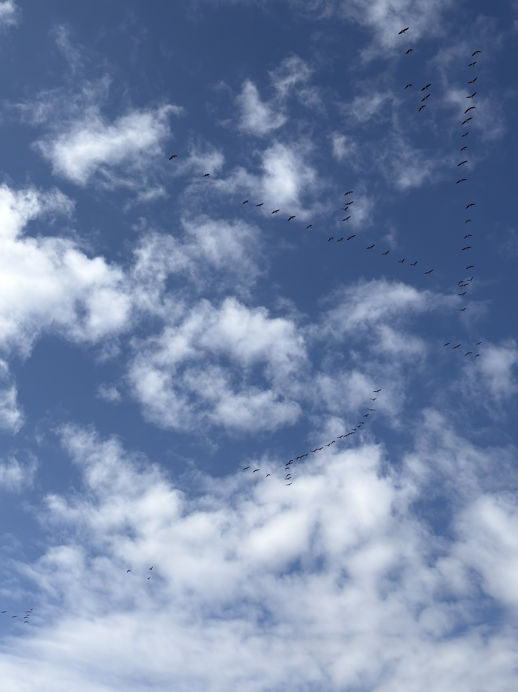 渡り鳥が並んで飛ぶ姿を見て