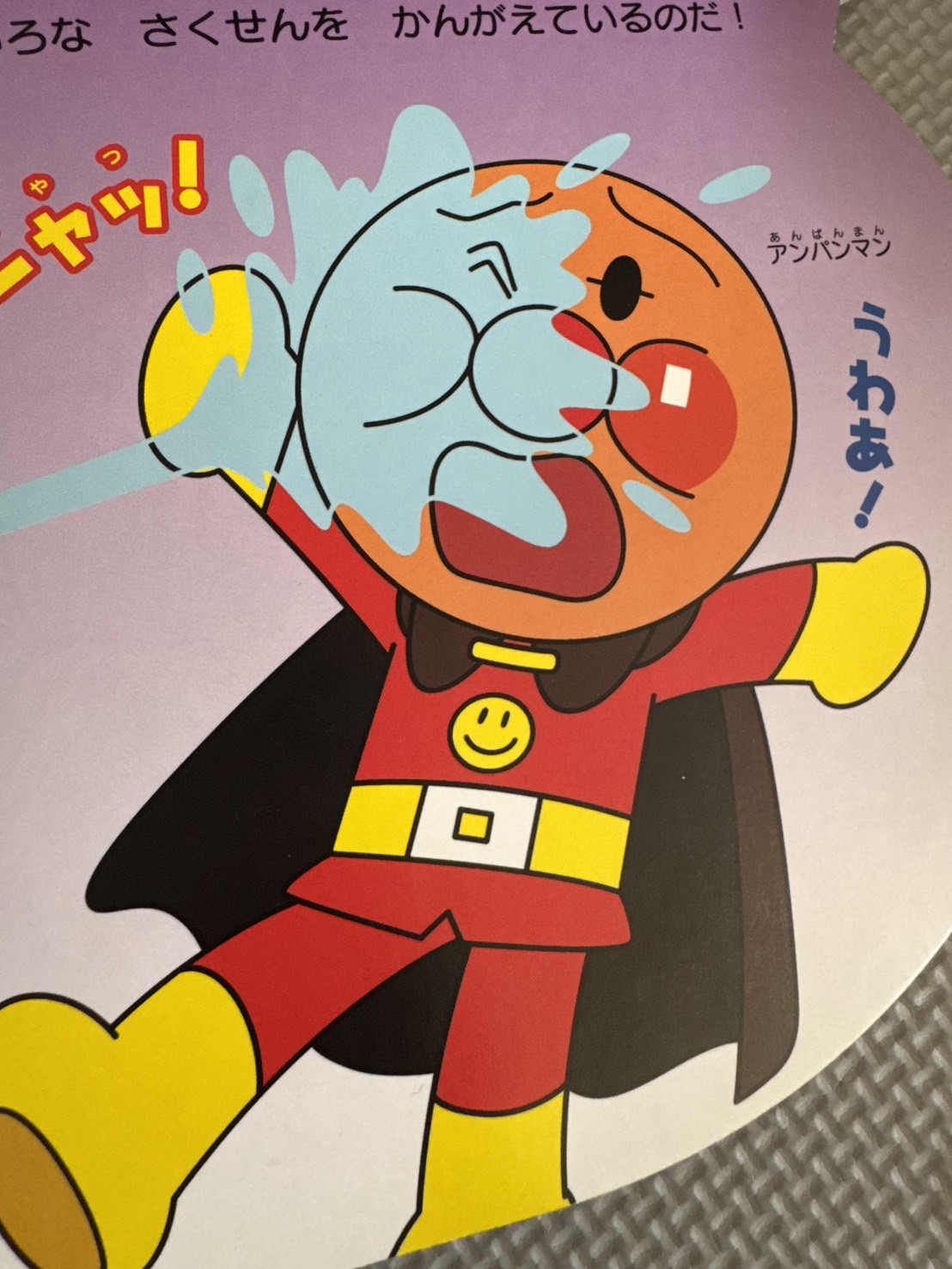 アンパンマンの絵本を見ながら「アンパンマン、バシャ!」と保育者が言うと、