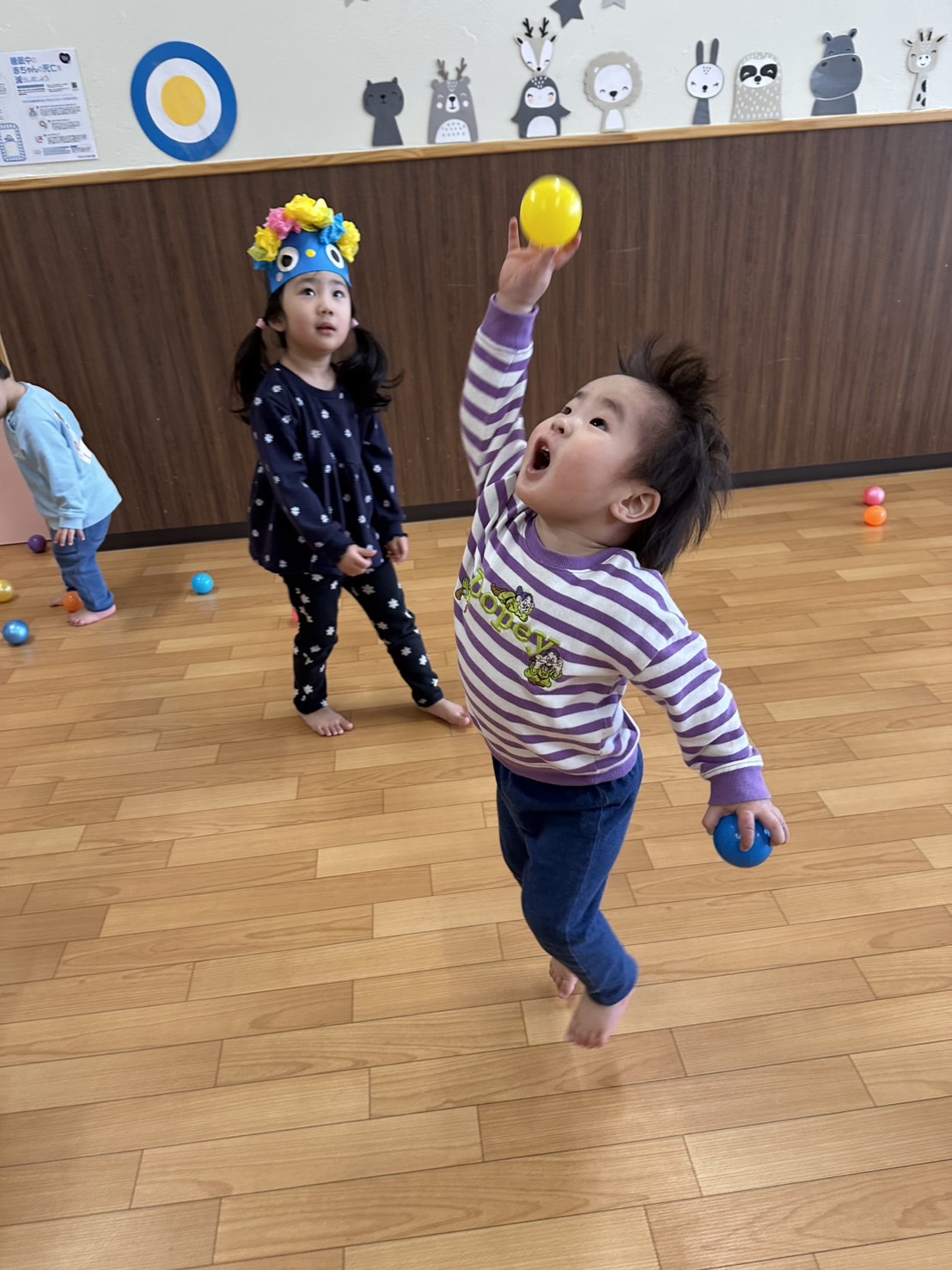 保育者がおんぶをしてボールを投げていました✨
