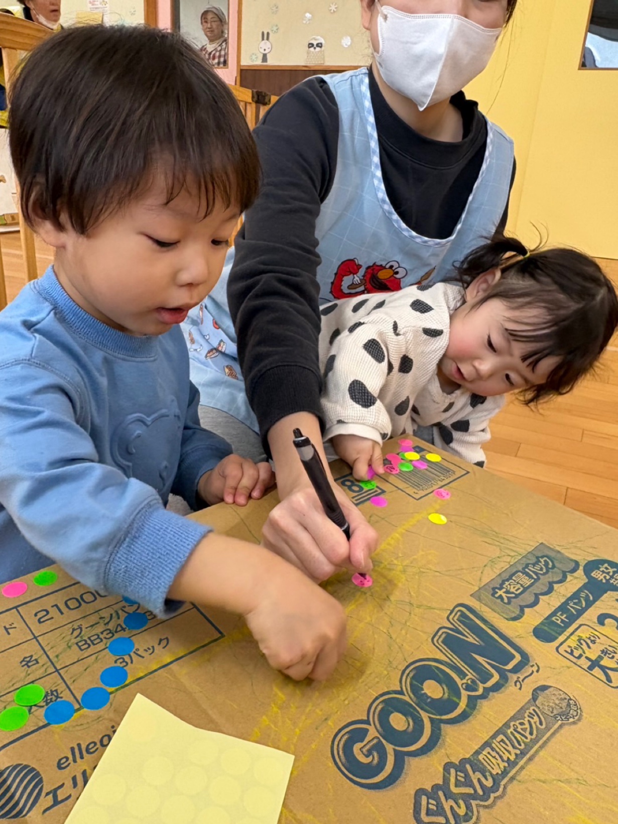ダンボールにシールを貼ったり、お絵描きをしました(^-^)