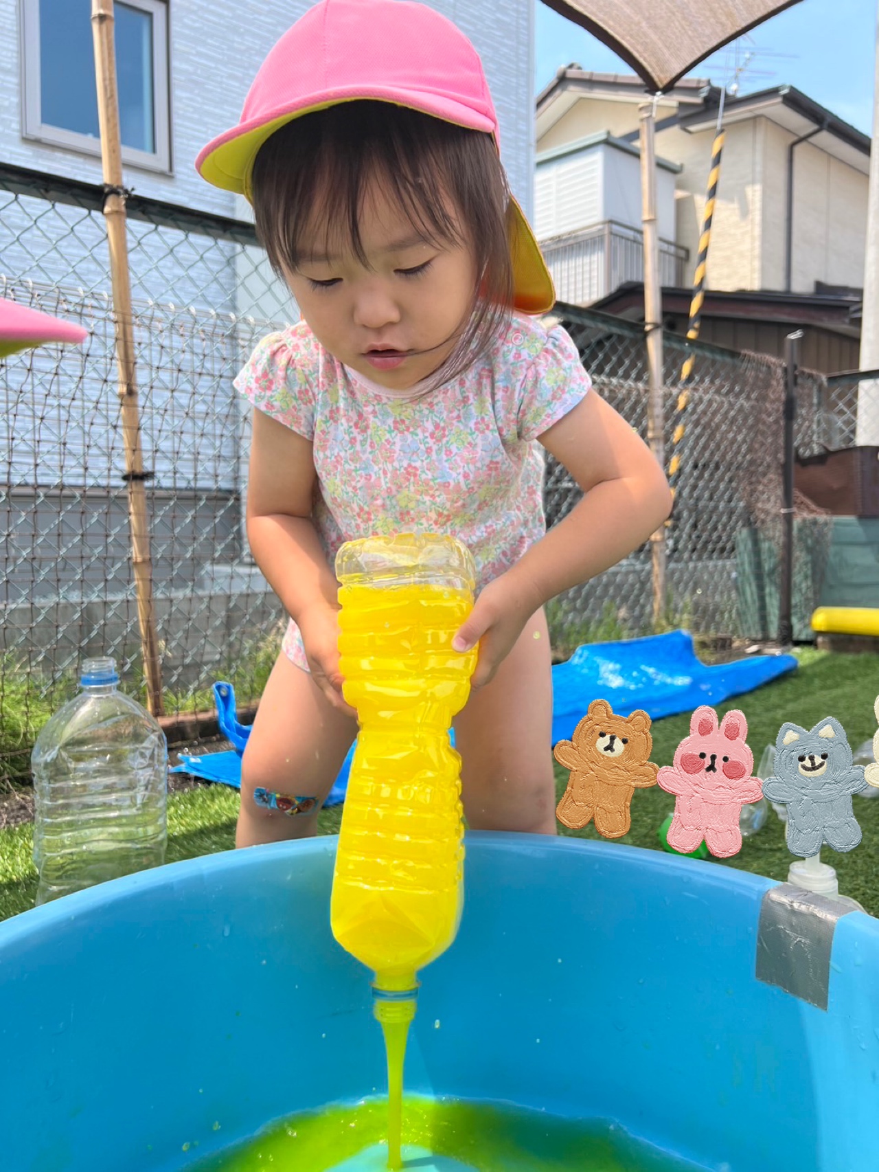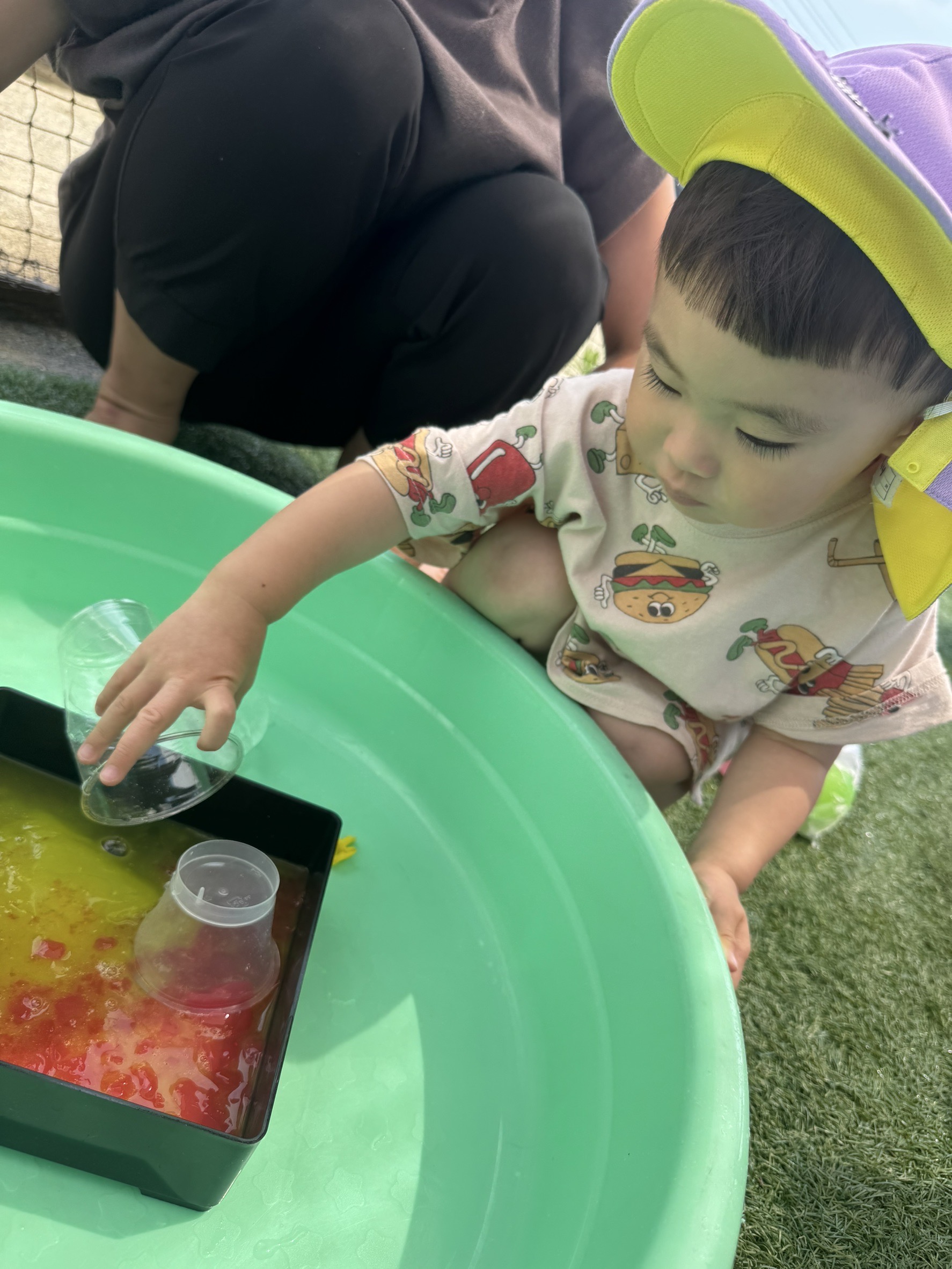 黄色の色水をタライにたくさん入れたよ☺️